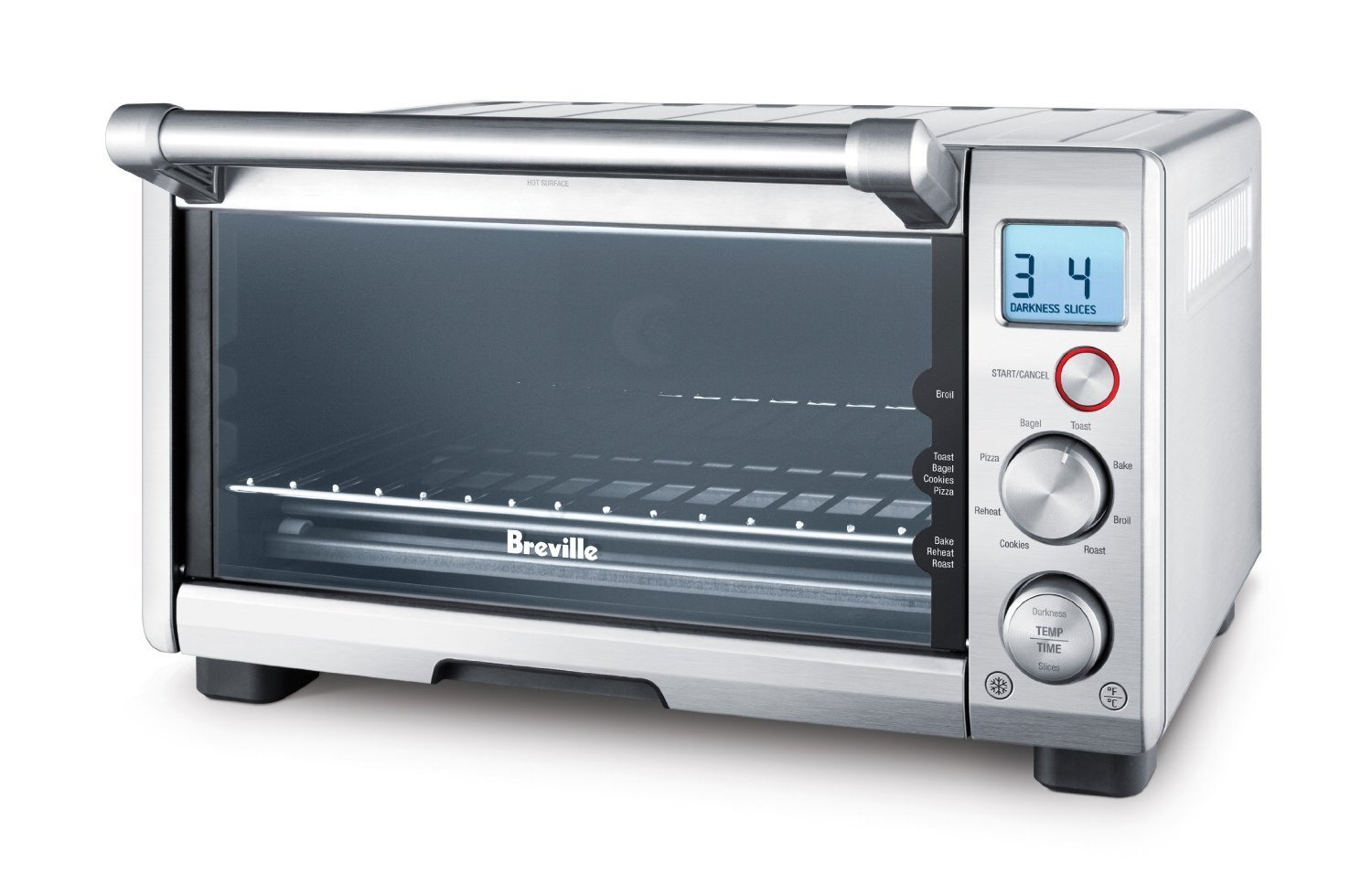 Bagel Setting heats the upper half of the bagel only for a crispy top and a soft, chewy bottom...the way a bagel should be! If you enjoy a bagel that is crispy on both sides, no need to engage the bagel button. Just toast it like you would a normal piece of bread without pressing the bagel button.the 4-Slice Oven with Tempered-Glass Door & 3 Rack Positions Countdown Metal Toaster by Cuisinart takes toasting to a whole new level. Separate controls defrost waffles before toasting, reheat toast without more browning and reduce heat on uncut side of bagels. Seven browning settings and self-adjusting slots mean thick and thin slices are toasted as desired. LCD countdown toasting-time bar display makes it easy to keep track. Perfect toast, English muffins, bagels and more.Broil at any temperature for proper browning and melting. Whether your London Broil recipe calls for a 500-degree oven or you want to delicately melt parmesan on bruschetta at a lower temperature, this Oster Digital Large Capacity Toaster Oven will produce the results you expect.4-Slice Oven with Tempered-Glass Door & 3 Rack Positions is best for youSimilar to the Breville Smart Oven, but in a smaller, more compact design, this 1800-watt oven offers exceptional cooking convenience while taking up less space on the counter. The unit's 3/5-cubic-foot nonstick interior can accommodate a 12-inch pizza or four slices of bread at a time, while its push-button and turn-knob control panel makes it easy to program. Turn the control dial to select the function--options include Toast, Bagel, Bake, Roast, Broil, Pizza, Cookies, and Reheat. The oven's Element IQ ''smart'' sensor technology puts the power where it's needed most to ensure energy-efficient operation. For each of the eight pre-set functions, Element IQ automatically adjusts the power and calculates the cooking time. The time and temperature for the pre-set programs can also be manually adjusted to accommodate individual preferences--the oven will even remember the new settings for next time.Use the second control dial for setting the time (from one minute up to two hours) and for adjusting the temperature (from 120 to 450 degrees F), as well as for selecting the number of slices and for setting the toast shade, from light to dark. The control panel also offers a large start/cancel button, a defrost button for frozen foods, and a temperature-conversion button for recipes with cooking temperatures in Celsius. The oven's easy-to-read backlit LCD screen shows the current function, temperature, and adjustments made--plus it illuminates orange to indicate preheating and cooking, then blue to indicate the end of the cooking cycle. Other highlights include a tempered-glass door, three rack positions, and a front-access removable crumb tray for quick cleanup. Accessories include a 10-by-10-inch enamel baking pan and a 10-by-10-inch enamel broil rack. Attractively housed in coated steel with a strikingly modern design, the countertop oven measures 16-1/2 by 14-1/4 by 10 inches.