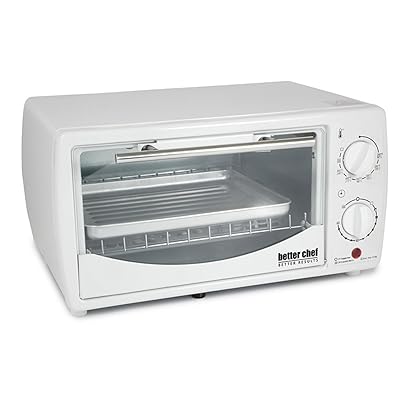Bagel Setting heats the upper half of the bagel only for a crispy top and a soft, chewy bottom...the way a bagel should be! If you enjoy a bagel that is crispy on both sides, no need to engage the bagel button. Just toast it like you would a normal piece of bread without pressing the bagel button.the Better Chef 0.32 Cubic Foot Tempered Glass Door Toaster Oven Broiler Accessories Included, Black/White (White) Countdown Metal Toaster by Cuisinart takes toasting to a whole new level. Separate controls defrost waffles before toasting, reheat toast without more browning and reduce heat on uncut side of bagels. Seven browning settings and self-adjusting slots mean thick and thin slices are toasted as desired. LCD countdown toasting-time bar display makes it easy to keep track. Perfect toast, English muffins, bagels and more.Broil at any temperature for proper browning and melting. Whether your London Broil recipe calls for a 500-degree oven or you want to delicately melt parmesan on bruschetta at a lower temperature, this Oster Digital Large Capacity Toaster Oven will produce the results you expect.Better Chef 0.32 Cubic Foot Tempered Glass Door Toaster Oven Broiler Accessories Included, Black/White (White) is best for youColor:White Dimensions: Overall Height - Top to Bottom: 8' Overall Width - Side to Side: 12' Overall Depth - Front to Back: 8' Overall Product Weight: 3 lbs